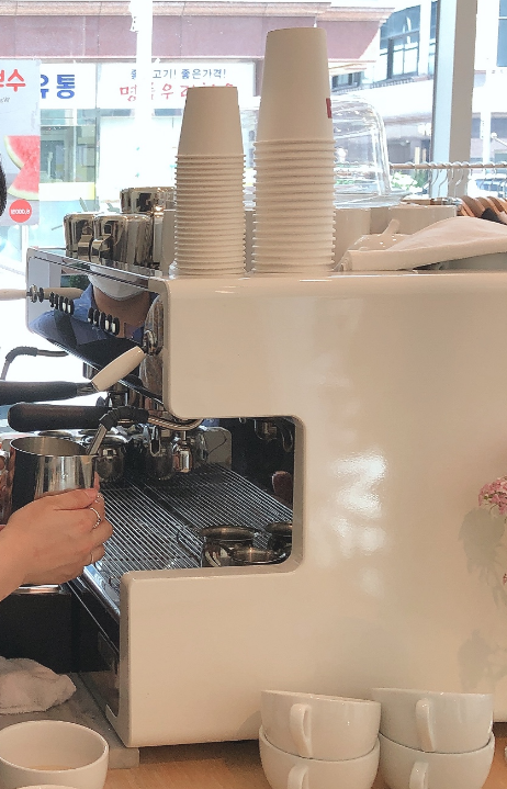 필요장비는 그라인더, 2구 머신에서 투샷추출을 하고 적당한 물을 넣어서 샷을 넣어 아메리카노를 만드는 과정입니다.